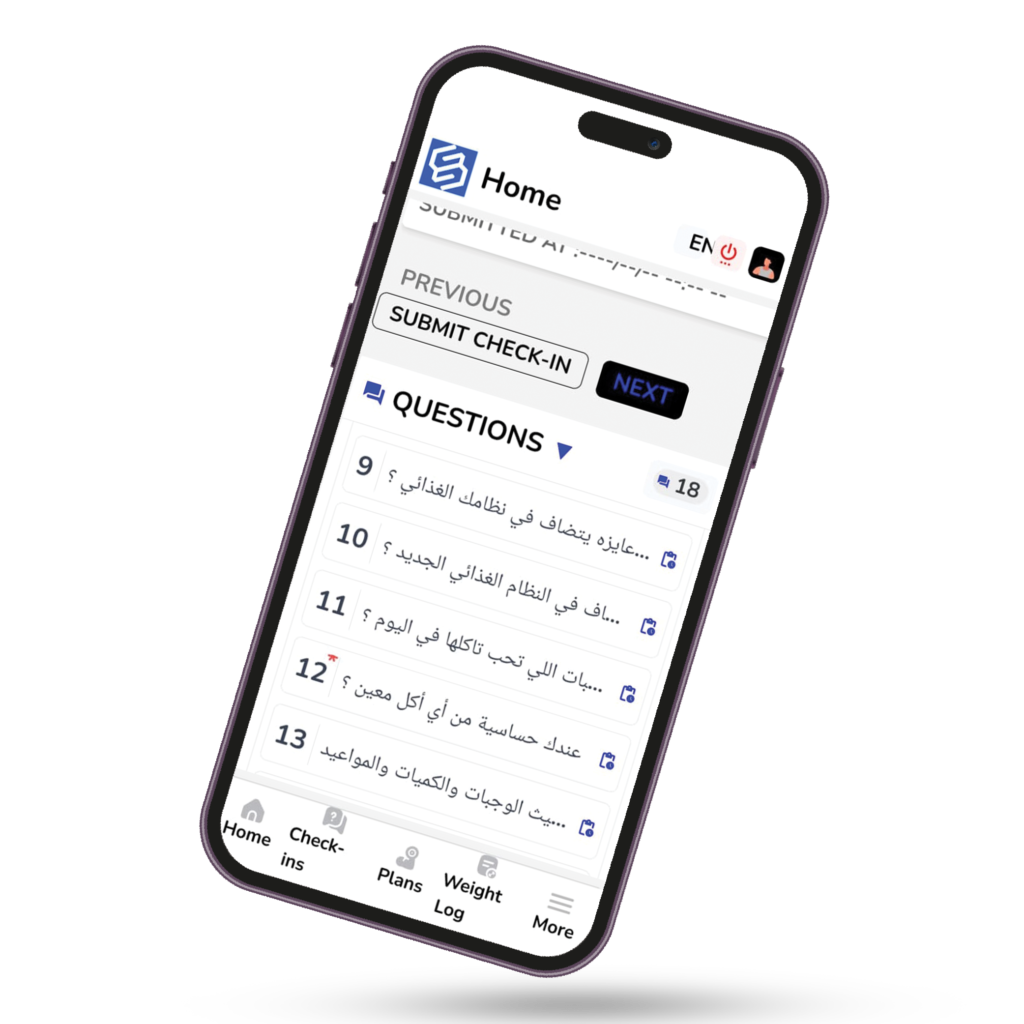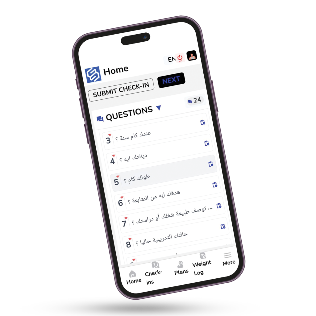 فورم البيانات الشخصية : ودي عبارة عن أسئلة بسألهالك مرة واحدة بس بعرف منها عمرك التدريبي , عندك اصابات ولا لا , أحسن نظام تدريبي بترتاح عليه , تاريخك مع الدايت , بتنام امتي وتصحي امتي , بتعاني من مشاكل صحية ولا لا وحاجات تانية كتير علشان أحطلك البرامج المثالية ليك ويكونوا مناسبين تماما ليك ولهدفك.